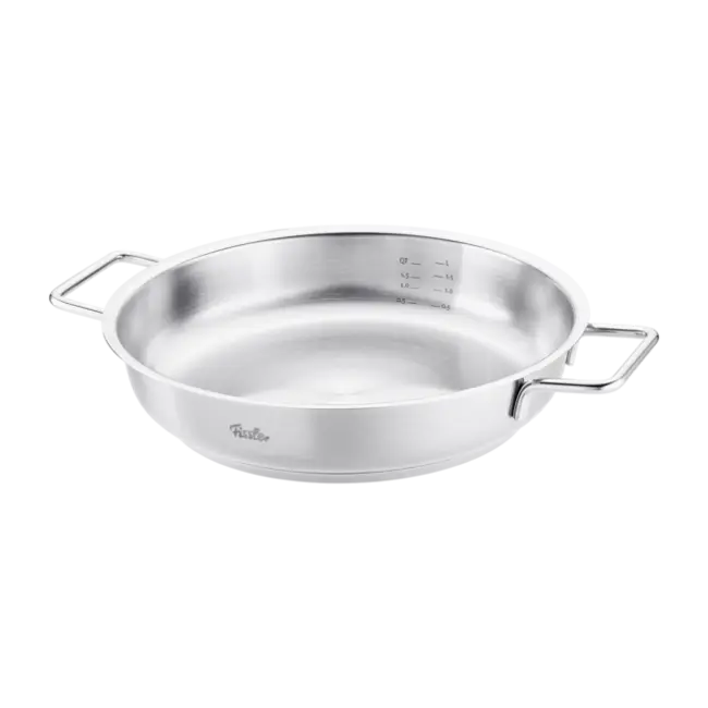 De Fissler Pure Collection serveerpan is de ideale mix van functionaliteit en een prachtig design. Met zijn ruime diameter van 28 cm en extra hoge rand is dit dé pan voor eenpansgerechten, grote porties groenten of een prachtig stuk vlees in saus. Dankzij de twee compacte zijgrepen neemt de pan minder ruimte in op de kookplaat én past hij moeiteloos in de oven.