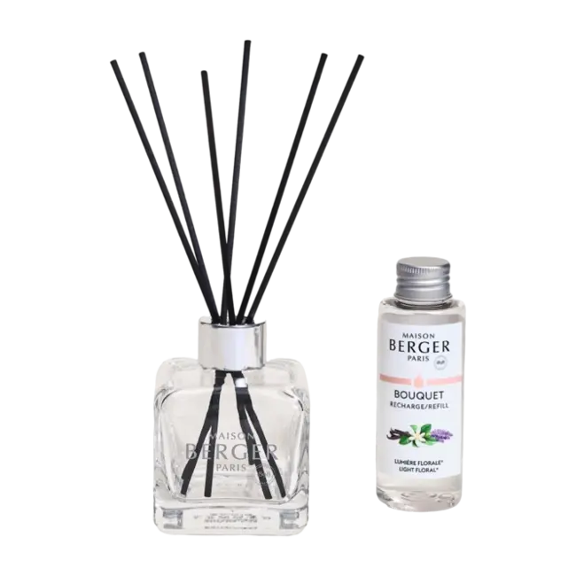 De Maison Berger Parfumsticks Cube is een stijlvolle en eenvoudige manier om je favoriete huisparfum te verspreiden. De transparante glazen flacon heeft een strakke vormgeving die rust uitstraalt op je dressoir, in de hal of in de badkamer. Gevuld met de geur Light Floral / Lumière Florale, brengt deze verspreider een lichte en zonnige ambiance in elke kamer.