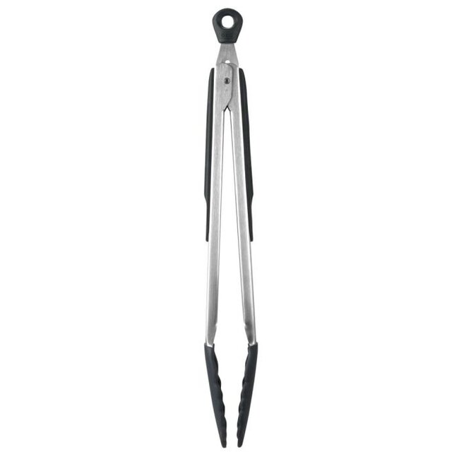 Deze serveertang van OXO Good Grips is perfect voor het keren en serveren van vlees, groenten en meer. Dankzij de hittebestendige siliconen koppen is de serveertang veilig voor gebruik in pannen met een anti-kleef laag. De serveertang ligt prettig in de hand dankzij de zachte anti-slip grepen. Na gebruik klik je de tang eenvoudig dicht voor compact opbergen, het slot is bovendien voorzien van een uitschuiftab die je als ophangoog kunt gebruiken. De serveertang is 30 cm lang, gemaakt van geborsteld roestvrijstaal en mag na gebruik in de vaatwasmachine.