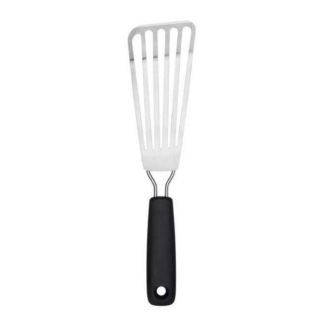 Deze Spatel RVS met sleuven van OXO Good Grips is perfect voor het bereiden van vis. Het slanke blad schuif je gemakkelijk onder de vis, om hem vervolgens te draaien of te serveren. De lange, mooi gevormde sleuven zorgen ervoor dat overtollig vet eenvoudig wegloopt. Deze spatel is voorzien van een zachte, comfortabele anti-slipgreep en een ophangoog. Na gebruik mag hij in de vaatwasmachine.
