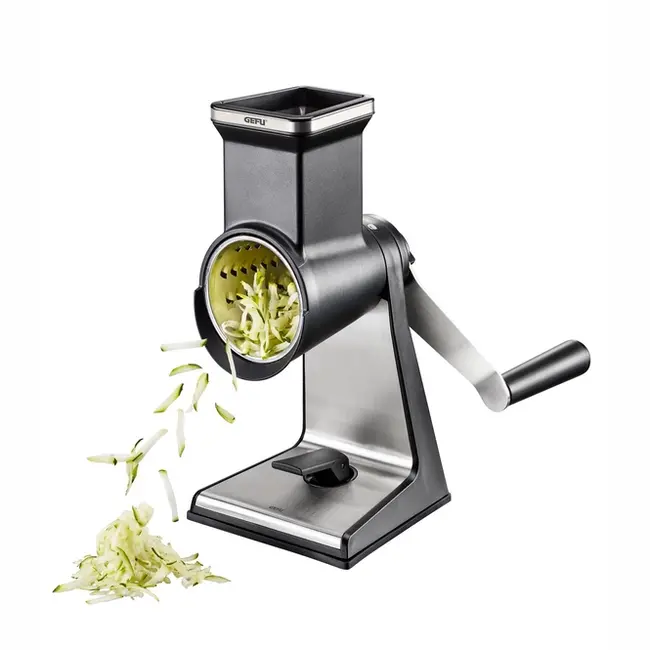 Drie Verwisselbare Trommels voor Divers Gebruik: De Gefu Trommelrasp wordt geleverd met drie verschillende trommels: een grove rasp, een fijne rasp en een snijschijf. Dit maakt het mogelijk om te variëren in textuur en snijdtechniek, van grof geraspte kaas tot fijn geraspte wortelen voor je favoriete salade.